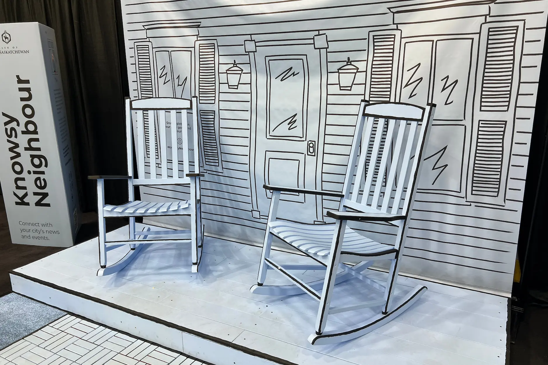 We developed the Knowsy Neighbour concept, inspired by the nostalgia of neighbours gathering on front porches to share stories and news over a glass of lemonade. Our team built a monotone porch setup, complete with rocking chairs, to create a welcoming and nostalgic environment. This setup encouraged attendees to sit and take photos, which they could then share on social media.
